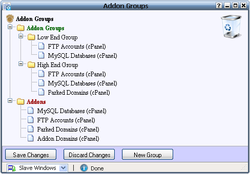 The New Group button is used to create a new addon group. An addon group can be dragged to the trash can on the top right to delete it.